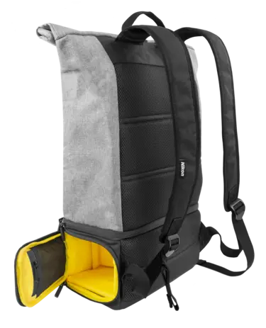 Практична раница с навиващ се капак, подходяща за фотоапаратите Nikon Z. Подплатеното отделение на дъното предоставя място за фотоапарата, обективите и аксесоарите ви, а също така съдържа и леснодостъпен страничен джоб, подходящ за съхранение на допълнителни обективи.